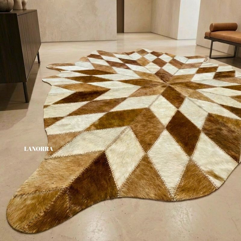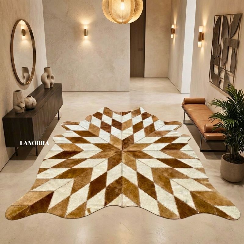 Kahverengi-Beyaz Dana Derisi Patchwork Halı LNRPW000047
