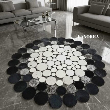 Puantiyeli Siyah-Beyaz Yuvarlak Dana Derisi Patchwork Halı LNRYH000020