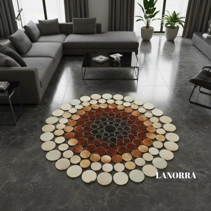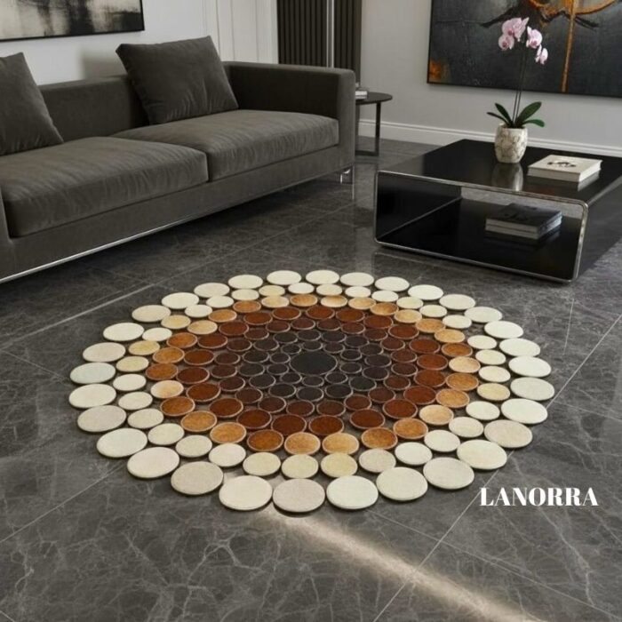 Puantiyeli Kahverengi Tonları Yuvarlak Dana Derisi Patchwork Halı LNRYH000014